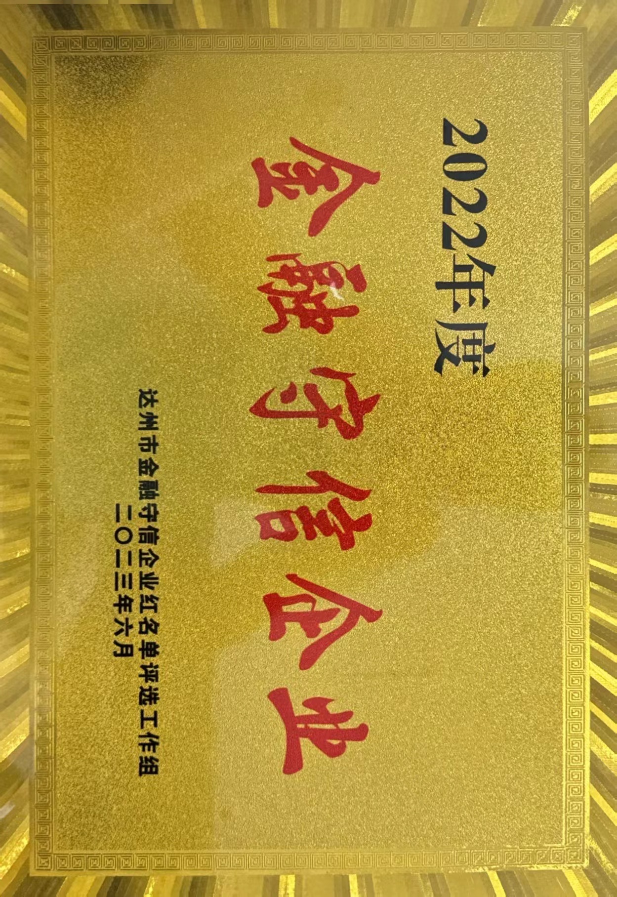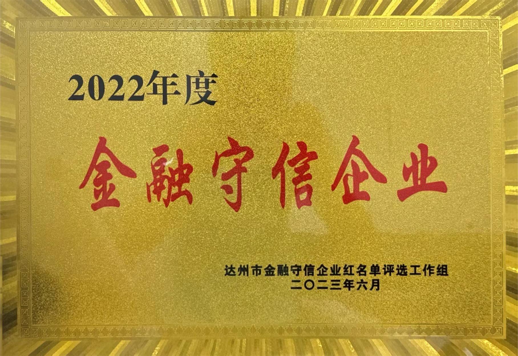 我司榮獲2022年度“金融守信企業(yè)”