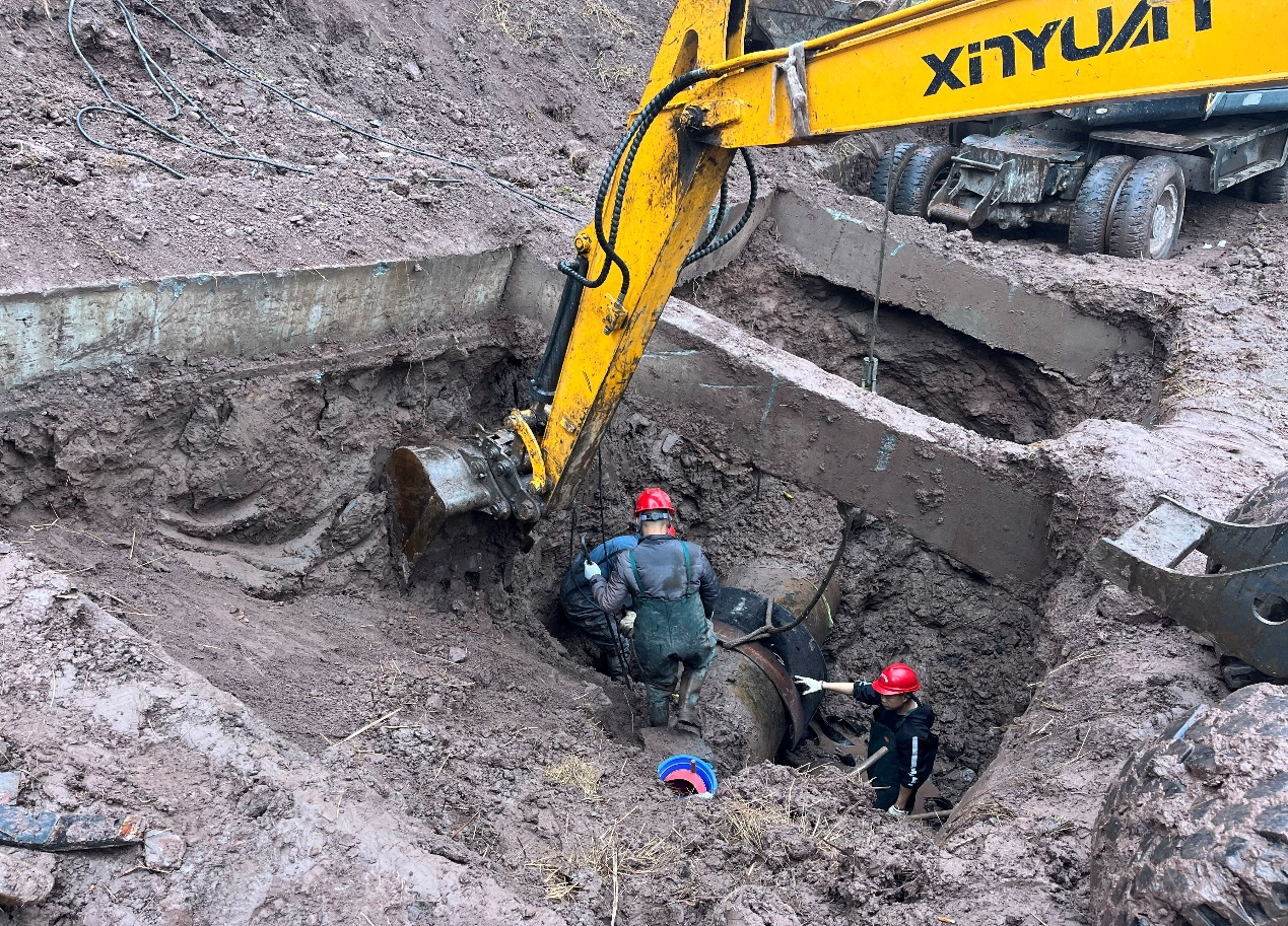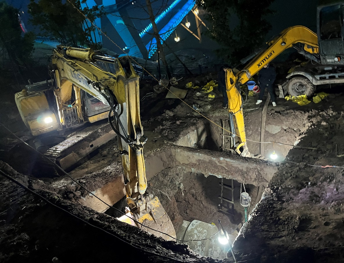 險(xiǎn)情發(fā)生后,水務(wù)集團(tuán)黨委高度重視,黨委書記、董事長盧輝帶隊(duì)奔赴搶險(xiǎn)現(xiàn)場指揮調(diào)度,要求惠泉公司立即組織搶修,盡快恢復(fù)管網(wǎng)運(yùn)行,盡最大努力減少污水外溢,集團(tuán)安全環(huán)保部、規(guī)劃建設(shè)部、惠潤達(dá)公司到場指導(dǎo)協(xié)助?;萑绢I(lǐng)導(dǎo)班子立即召開緊急現(xiàn)場會,連夜組織調(diào)度搶險(xiǎn)人員和設(shè)備,出動搶險(xiǎn)人員100余人次,挖掘機(jī)、吊車、多功能搶險(xiǎn)車等工程機(jī)械10余臺,合理調(diào)配人手,組建臨時(shí)班組,采取人機(jī)輪班,就地休息的方式,在確保安全的情況下,迅速開展搶險(xiǎn)工作。