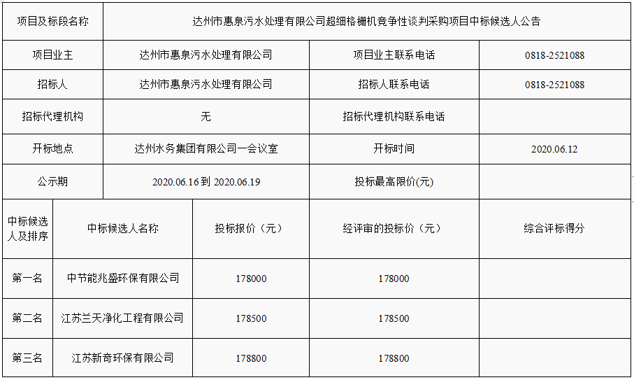 標(biāo)題:達(dá)州市惠泉污水處理有限公司超細(xì)格柵機(jī)競爭性談判采購項(xiàng)目中標(biāo)候選人公告