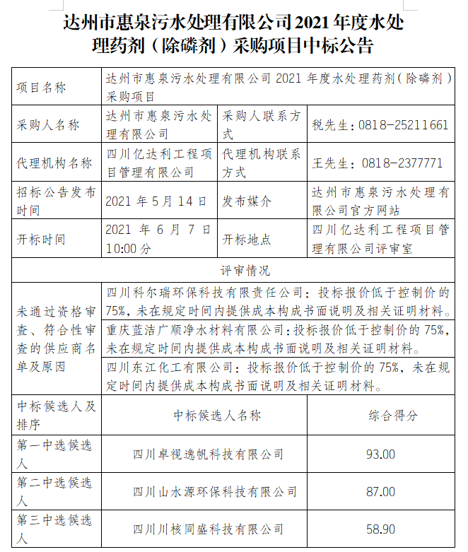 標(biāo)題:達(dá)州市惠泉污水處理有限公司2021年度水處理藥劑(除磷劑)采購項目中標(biāo)公告